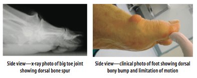 Radiographs are able to show progressive changes associated with degenerative joint disease, however they are not able to show damage to the joint cartilage, which is almost always present. Surgery is aimed at decompressing the joint and removing as much of the bone spurs or fragments as possible. Often it is necessary to perform an osteotomy of the first metatarsal in order to help correct structural components of the condition. Interposition of soft tissue into the joint itself may also be performed.
