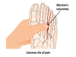 The most common symptom of a neuroma is localised pain in the interspace between the third and fourth toes, although it can occur in other toes too. It can be sharp, radiating, or lancinating, and there may be associated numbness or tingling. Often patients find it difficult to describe the type and location of the pain. Sometimes it feels like a crumpled up sock inside your shoe. Usually some relief is obtained by taking off the shoe and giving the area a rub. Surgical intervention involves decompressing or resecting the nerve, or both.